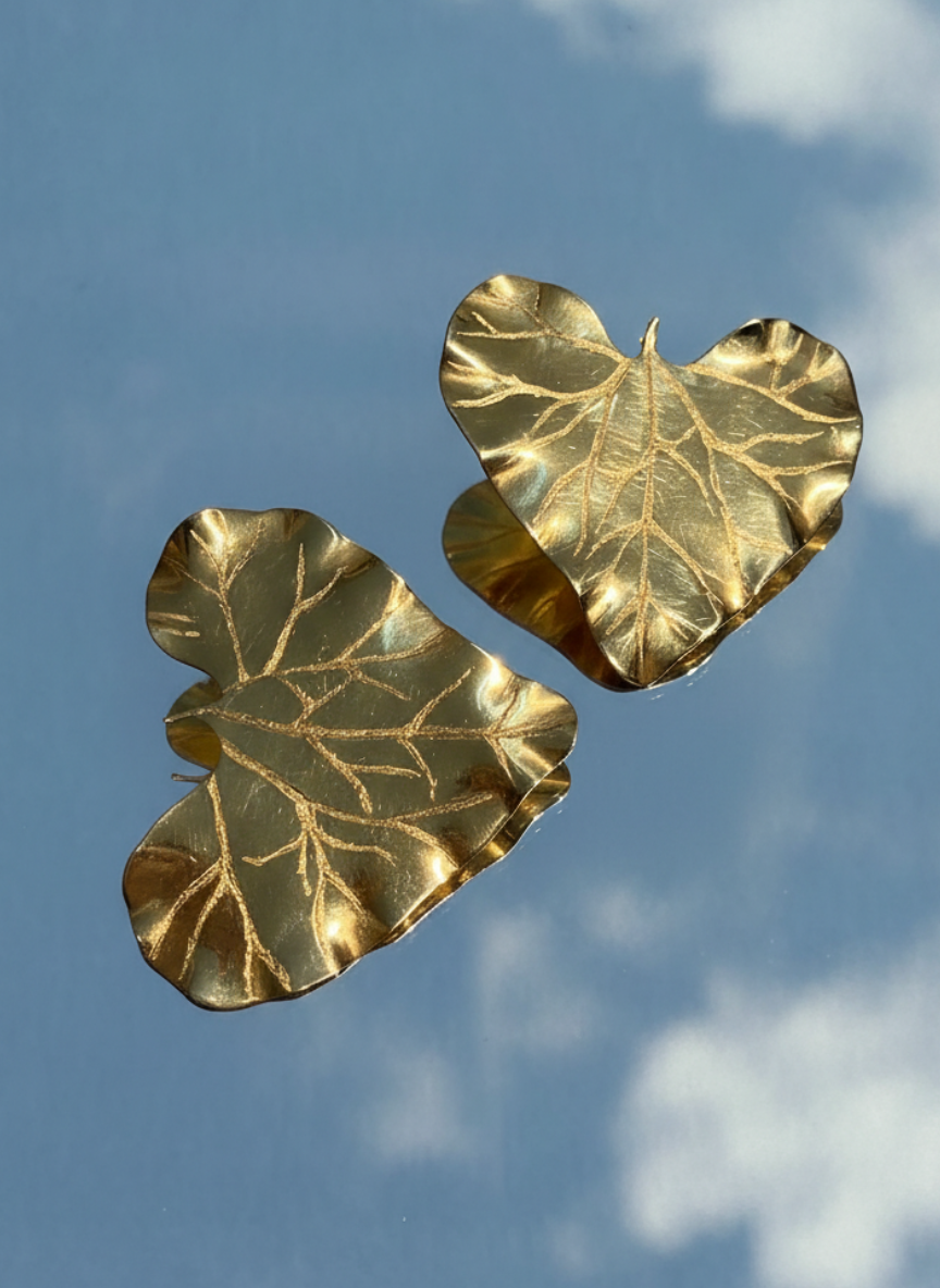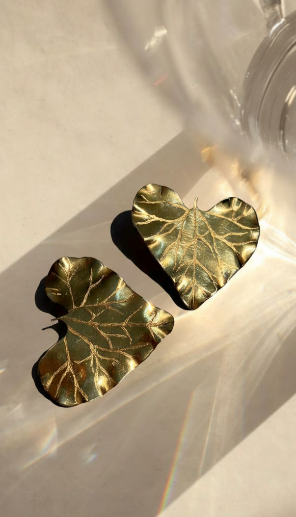 Estos aretes de corazón hechos a mano nacen de una hoja real de Aristolochia, planta trepadora conocida por sus flores exóticas y sus hojas cordadas (en forma de corazón), también llamada flor pelícano o flor de nacimiento.